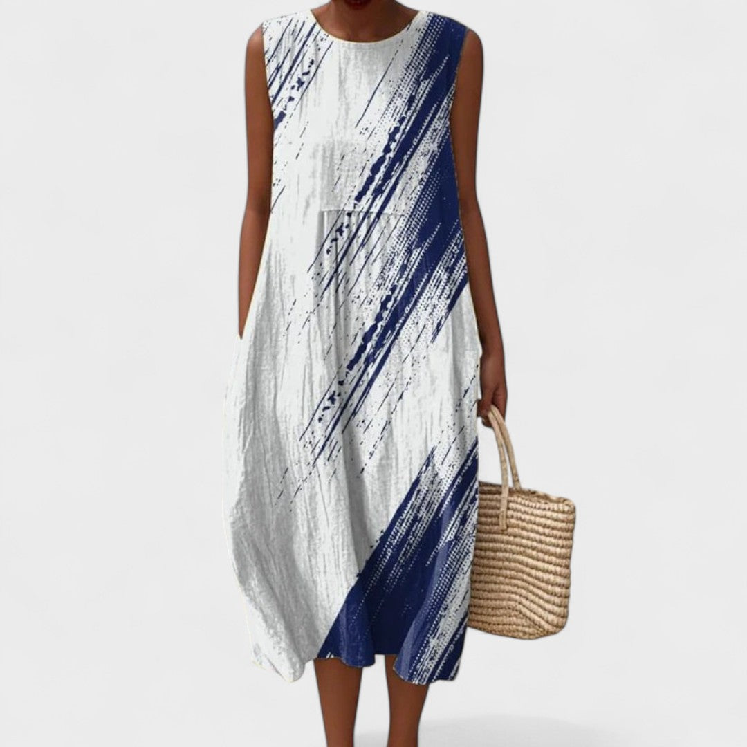 Тази лека и въздушна рокля перфектно комбинира стил и практичност, давайки ви свобода на движение и изискан вид във всички поводи. Нейният свободен крой и цветен десен я правят идеален избор за плажа, разходка из града или летни срещи.