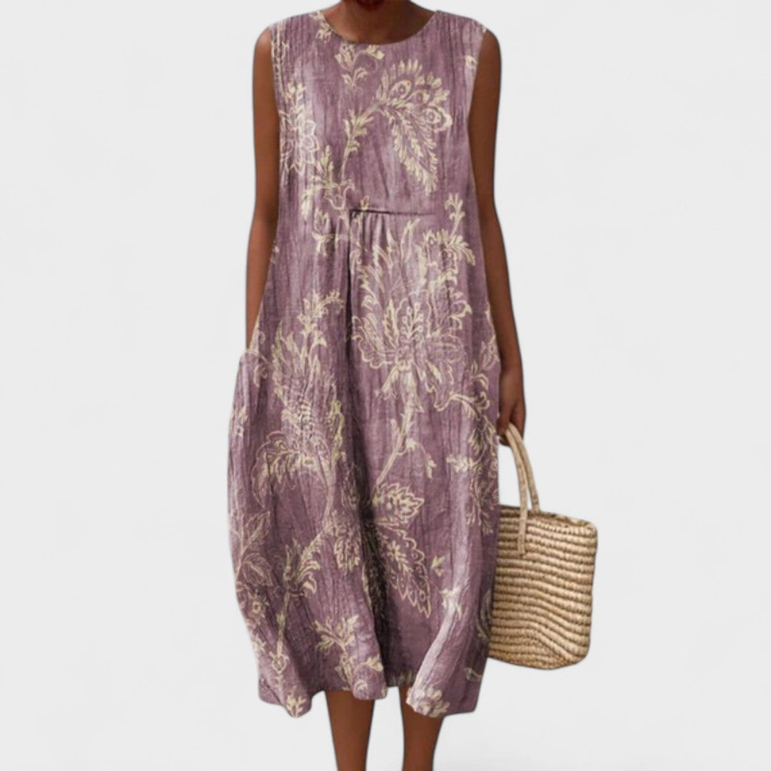 Тази лека и въздушна рокля перфектно комбинира стил и практичност, давайки ви свобода на движение и изискан вид за всички поводи. Нейният разкроен силует и цветен десен я правят идеален избор за плажа, разходка из града или летни срещи.