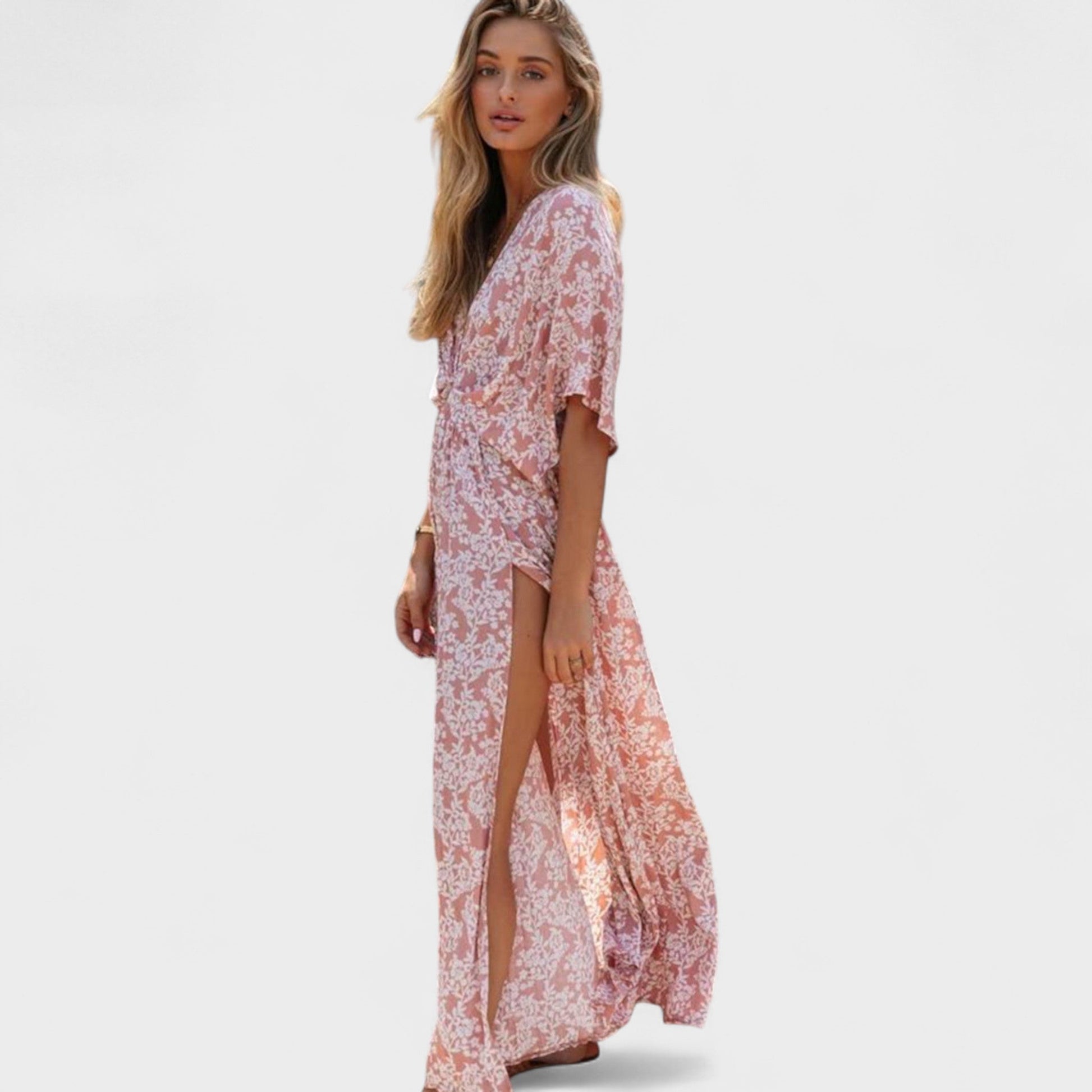 Тази бохо рокля в нежни тонове с елегантен разрез е перфектният избор за летни дни и вечерни излизания. Летящият силует подчертава женствеността, докато разрезът добавя доза съблазнителност и лекота. Идеална за плажа, разходки край морето или специални поводи, когато искате да блеснете.