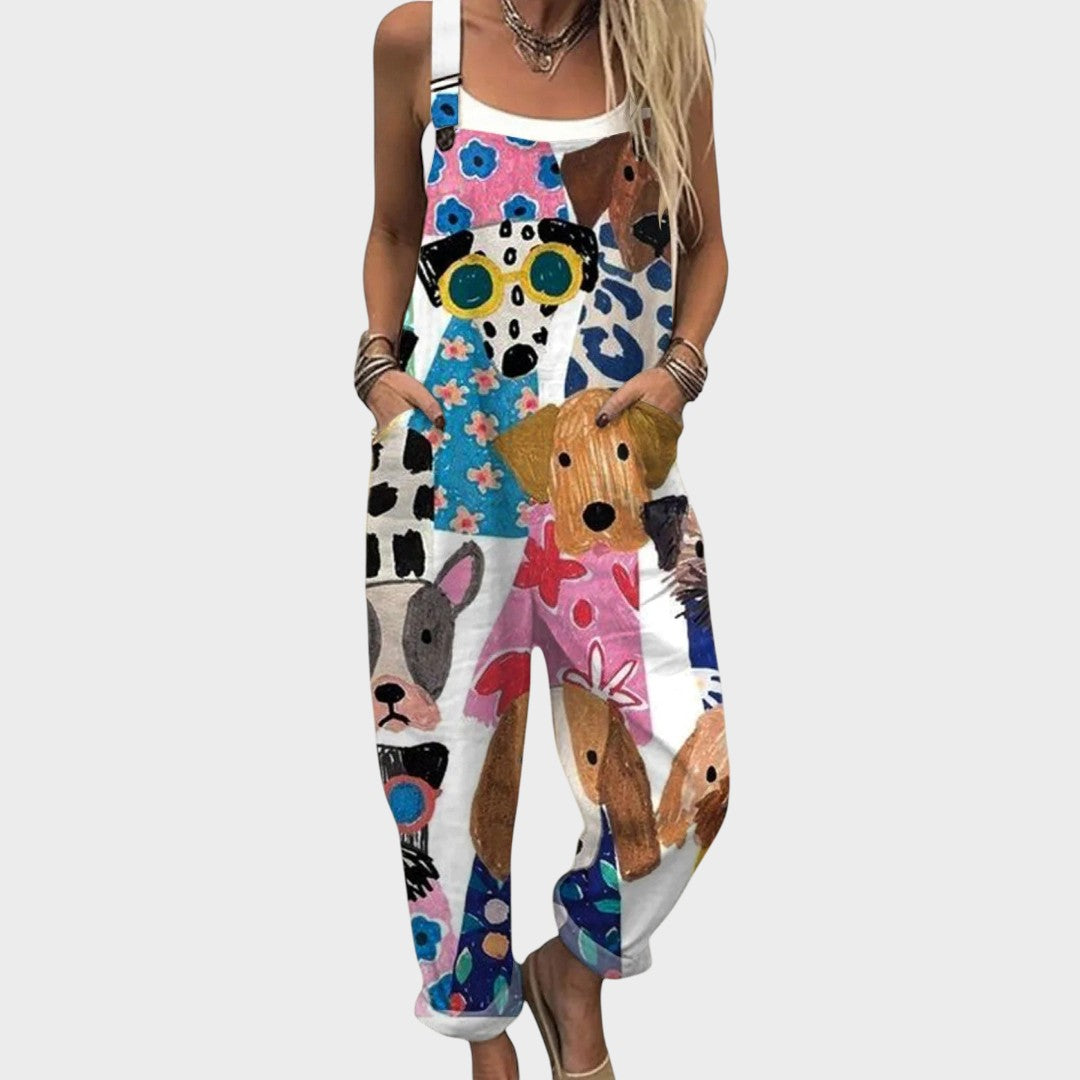 Този лек комбинезон съчетава комфорт и уникален дизайн в парче облекло, което ще обожавате да носите всеки ден. С широкия си крой, практични джобове и игриви детайли, той е перфектен за разходки, екскурзии или релаксиращи моменти у дома.