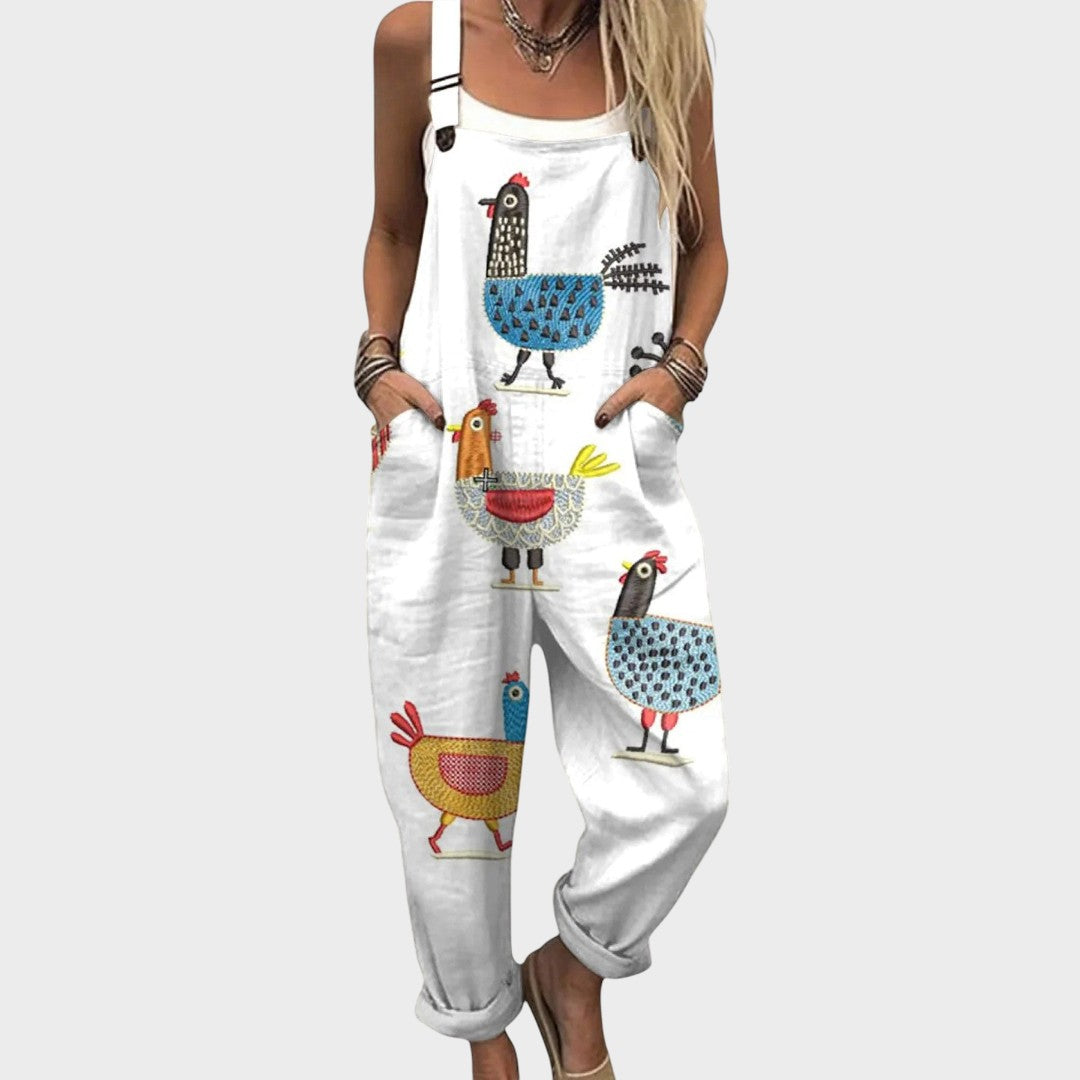 Този лежерен комбинезон съчетава комфорт и уникален дизайн в парче облекло, което ще обожавате да носите всеки ден. С широк крой, практични джобове и игриви детайли, той е перфектен за разходки, екскурзии или релаксиращи моменти у дома.