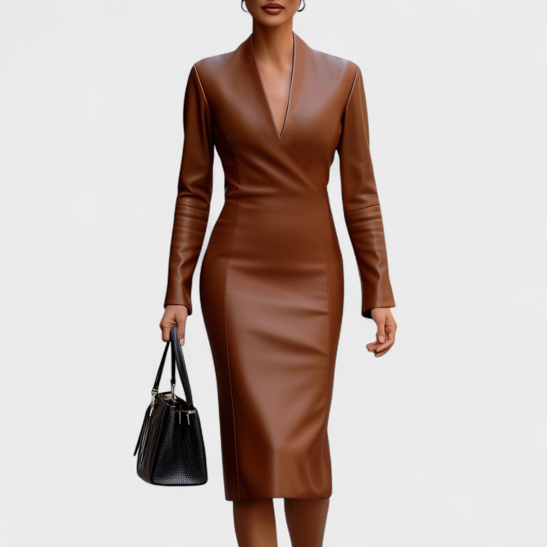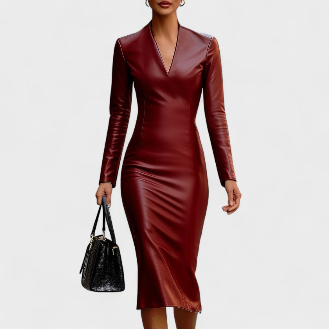Тази тясна рокля от изкуствена кожа е перфектният избор за жени, които искат да подчертаят своята увереност и изтънченост. Модерният крой, който следва линията на тялото, акцентира на фигурата, докато материалът с висок блясък придава смел и луксозен вид. Идеална е за вечерни излизания, специални събития или моменти, когато искате да оставите силно впечатление.