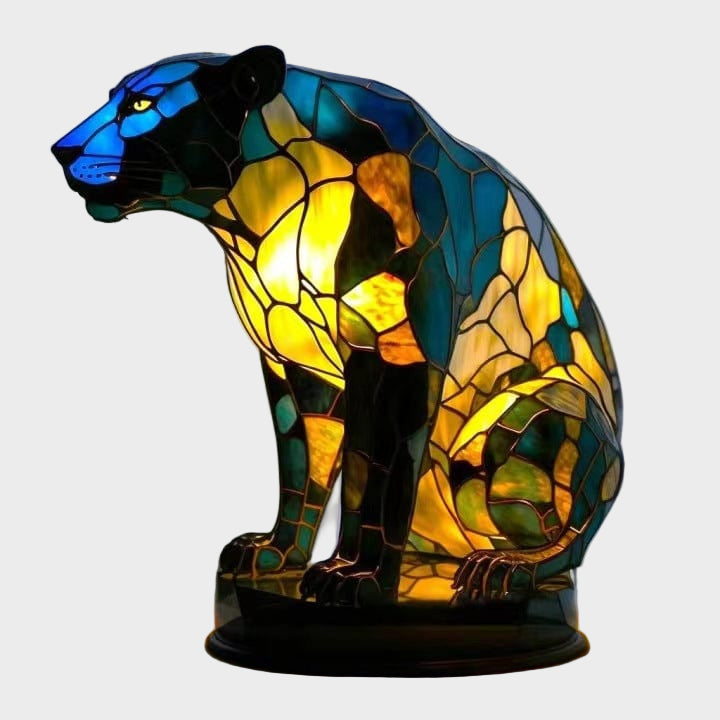 Изящна, мощна и загадъчна—тази лампа с пантера излъчва смела светлина през дълбоките си сини и златисти тонове. Декоративен елемент, който въплъщава грация и интензивност.