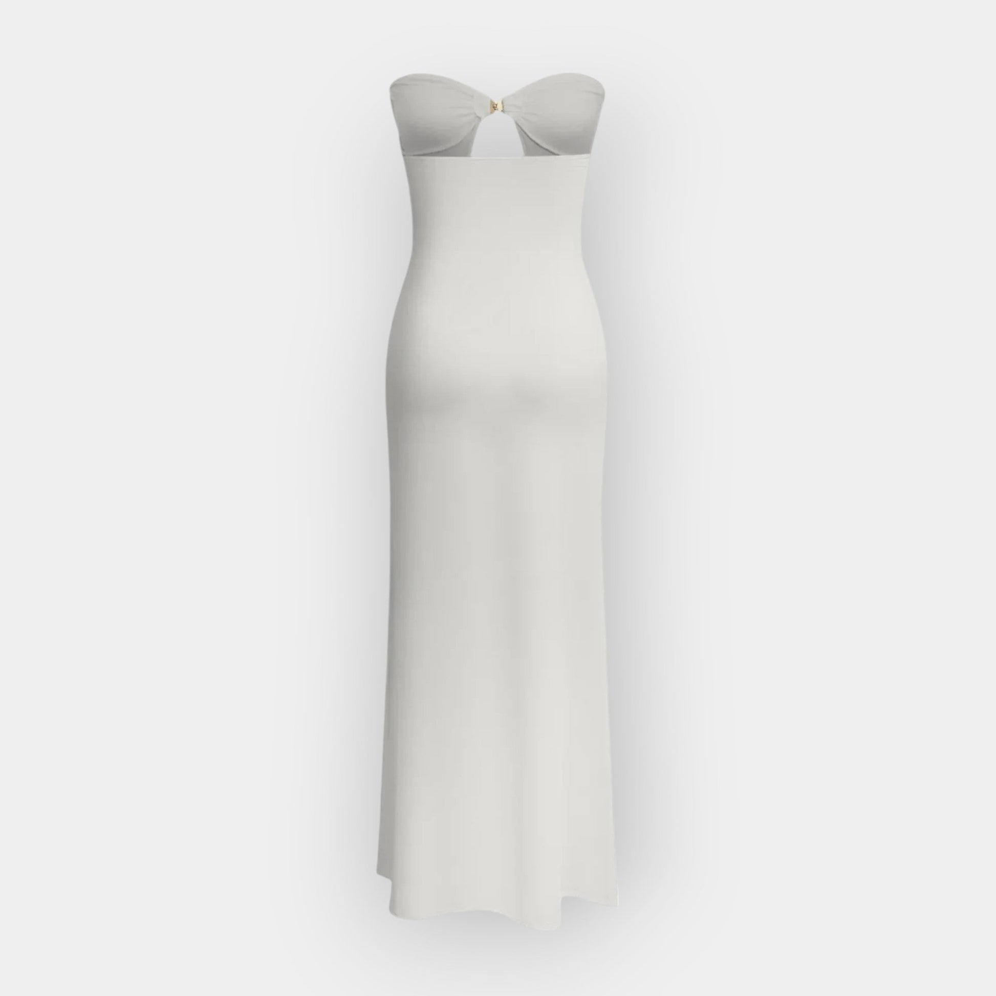 Елегантна и ефирна, тази рокля без презрамки подчертава женствеността с дискретен стил. Идеална за слънчеви дни и летни вечери с елегантност и комфорт.