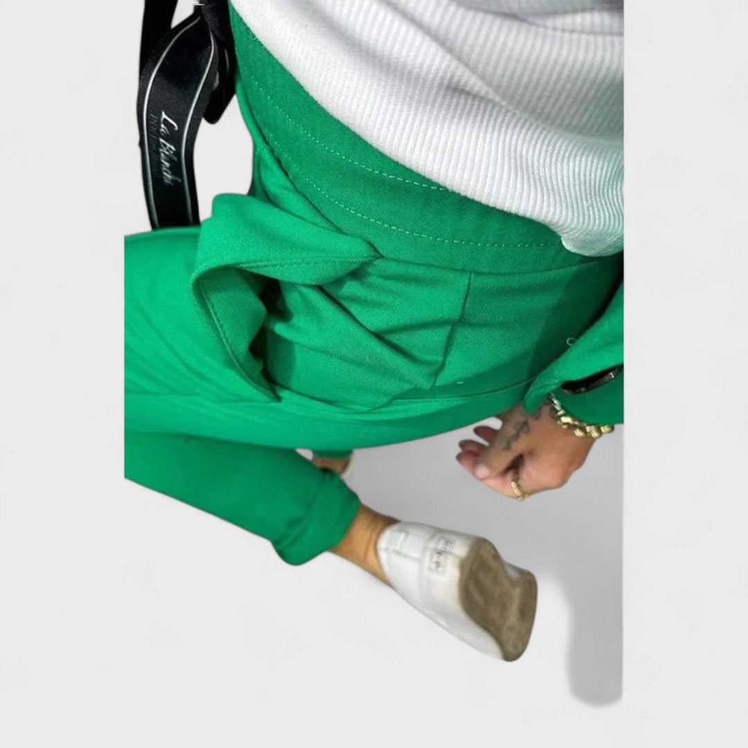 Стилен зелен комплект: сако и спортни панталони