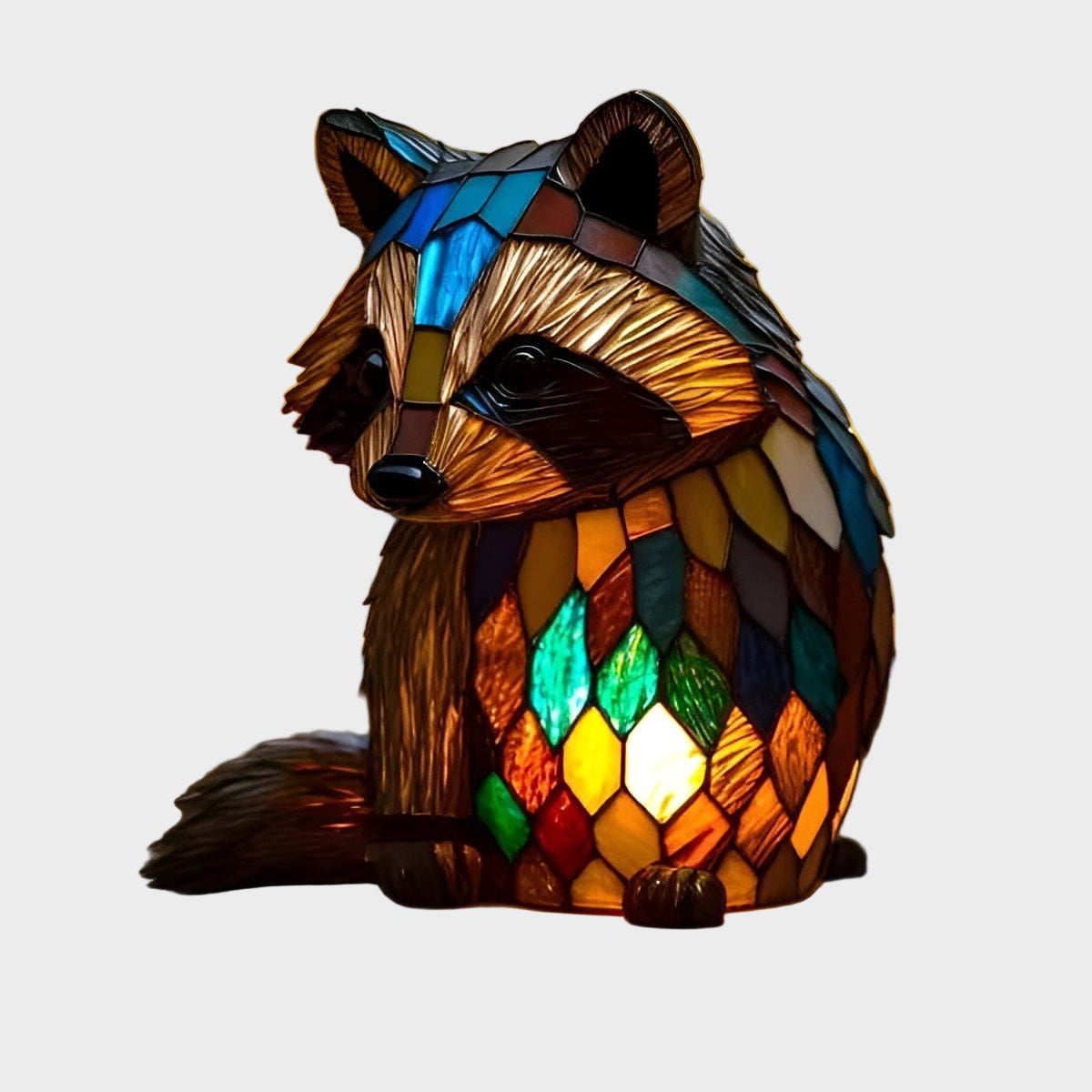Тази лампа с енот улавя игривия дух на гората в ярък витражен дизайн. Забавен акцент, който също така служи като топъл, уютен източник на светлина.