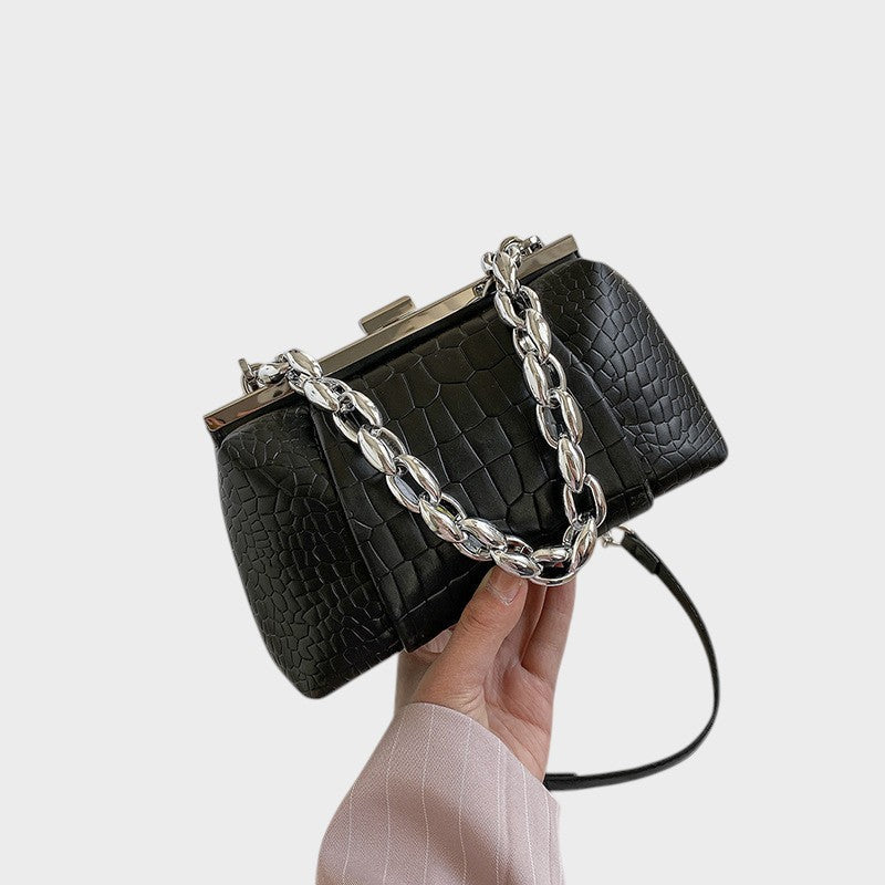 С текстура на крокодил и здрава структура, тази чанта съчетава изтънченост и индивидуалност в един аксесоар. Нейният класически метален цип и здравата верижна дръжка създават модерен и впечатляващ контраст. Идеална е за тези, които търсят компактен, практичен елемент с силно присъствие, било за деня, било за нощта.